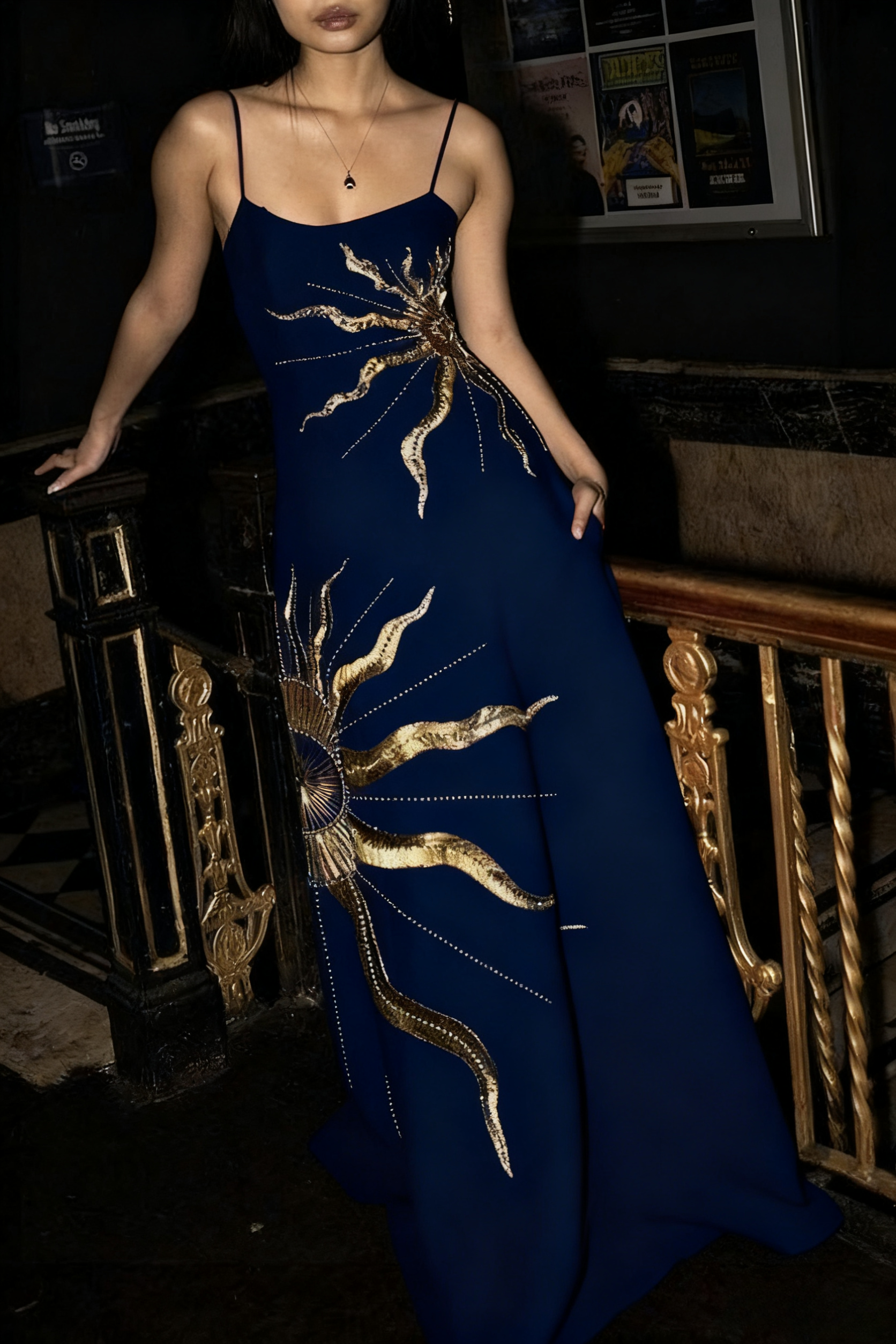 Chic A Line Spaghetti Straps Satin With Gold Embroidery Long Prom Dress,Evening Dress GG1154
