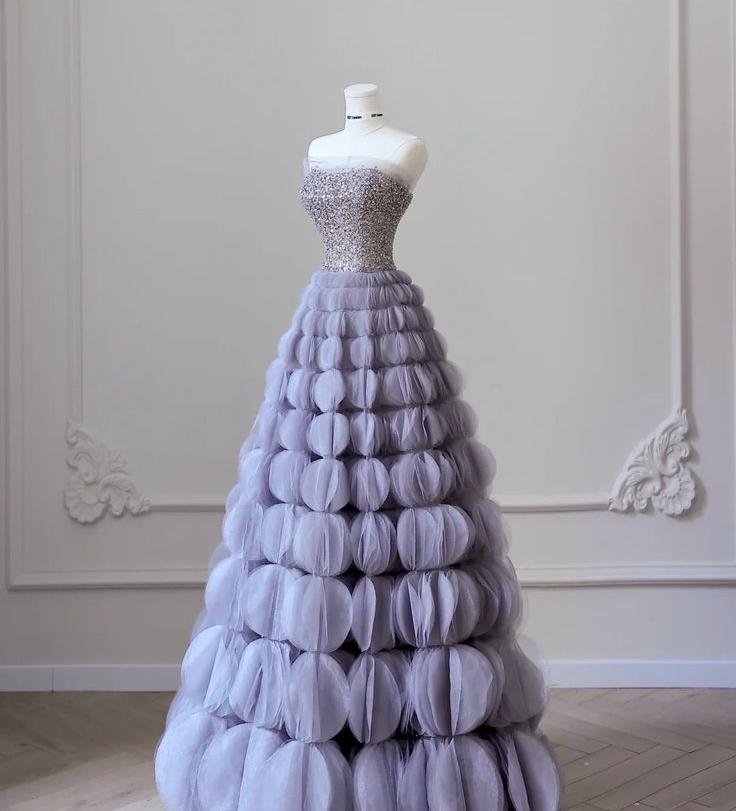 Chic A Line Strapless Lilac Beading Tulle Long Prom Dress, Evening Dress GG421