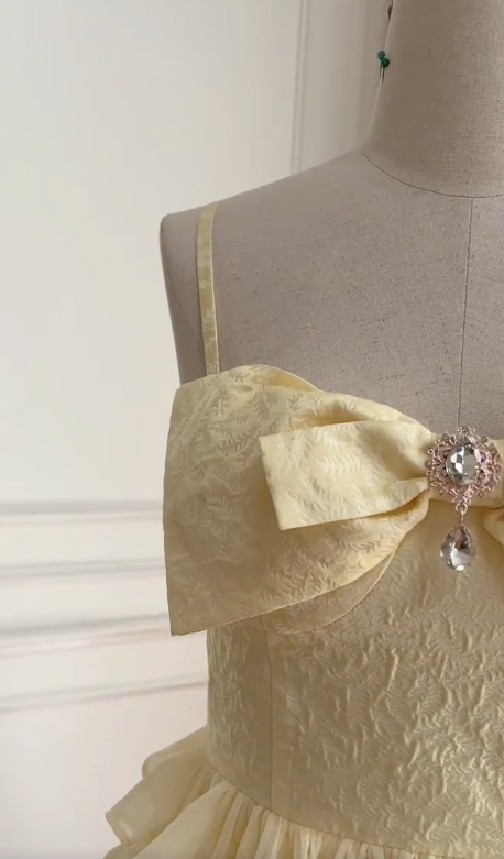 Cute A Line Spaghetti Straps Pastel Yellow Satin Tiered Long Prom Dress, Party Dress, Evening Dress GG2907