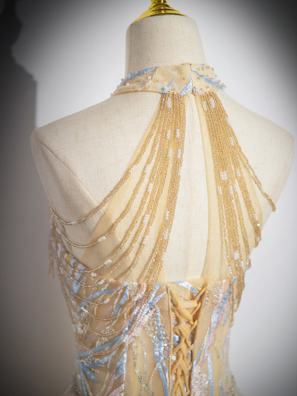 Delicate A line Champagne Tulle Halter Beading Prom Dress GG009