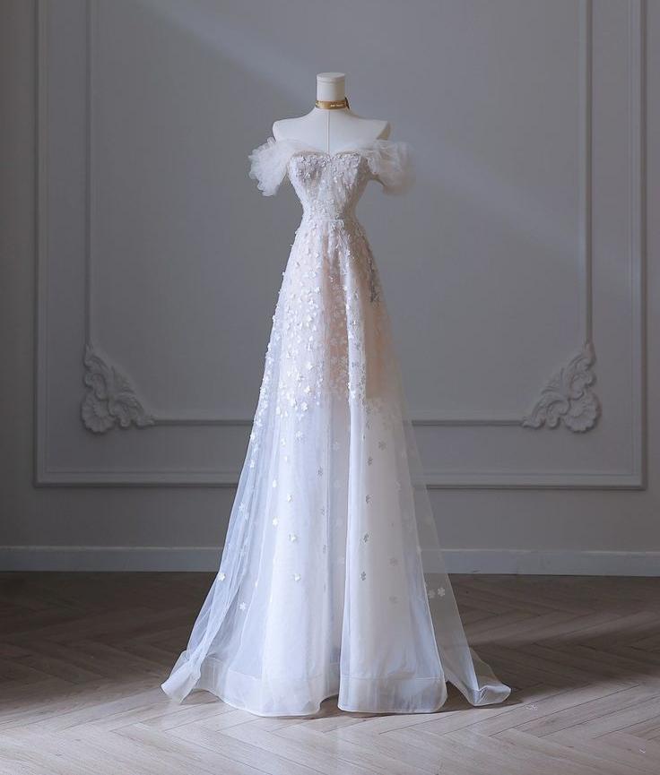 Elegant A Line Off The Shoulder Light Pink Tulle Applique Long Prom Dress, Evening Dress GG417