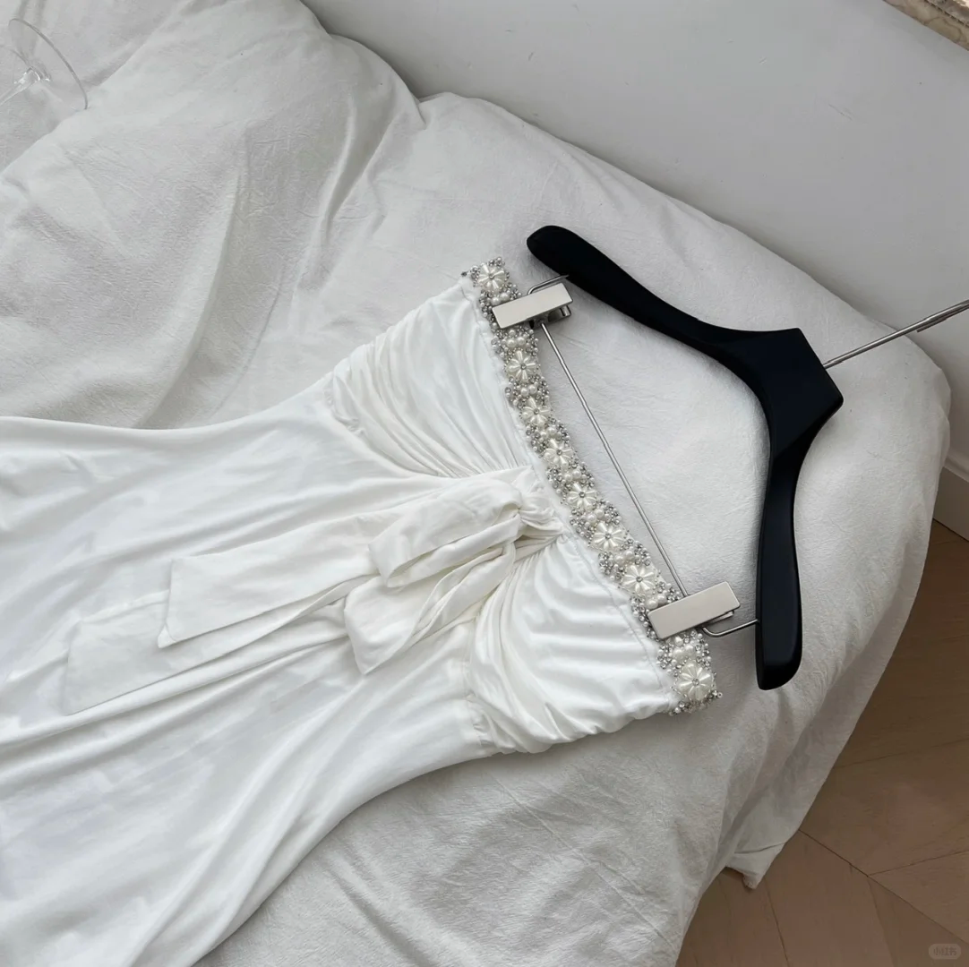 Elegant A Line Strapless White Satin Beads Short Homecoming Dress,Summer 18th Birthday Dress GG4063