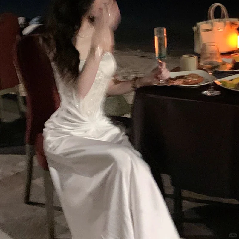 Elegant Mermaid Spaghetti Straps White Satin Pleated Long Prom Dress, Party Dress, Evening Dress GG2921