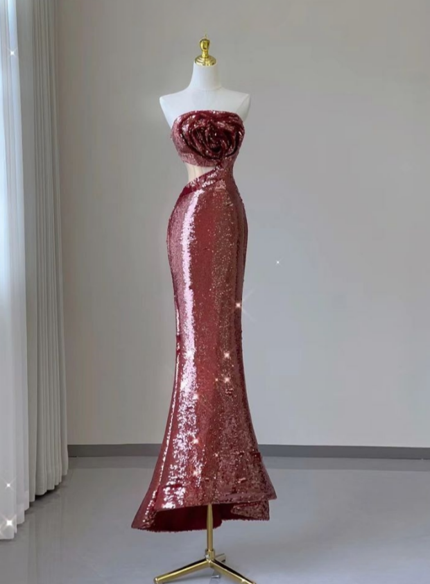Glam Mermaid Strapless Satin Flower Sequin Long Prom Dress,Evening Dress GG964