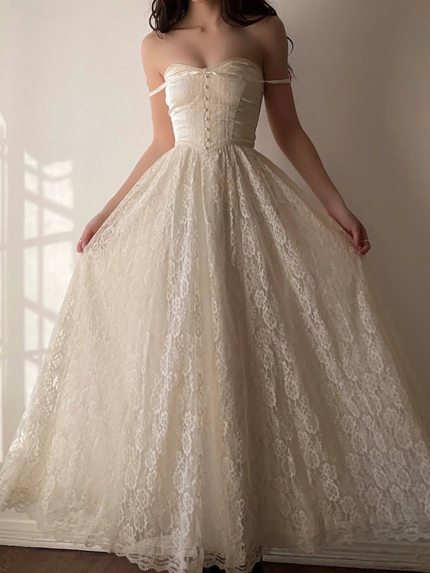 Glamorous A Line Spaghetti Straps Off White Lace Long Prom Dress,Evening Dress GG1253