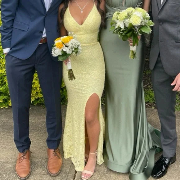 Pretty Mermaid Spaghetti Straps Pastel Yellow Satin Lace Slit Long Prom Dress,Evening Dress GG2141