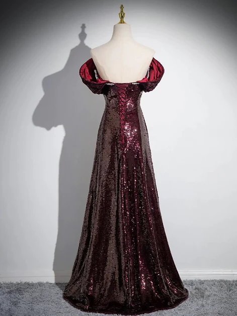 Shiny A Line Off The Shoulder Maroon Sequins Beaded Long Prom Dress, Maroon Simple Evening Dress GG191