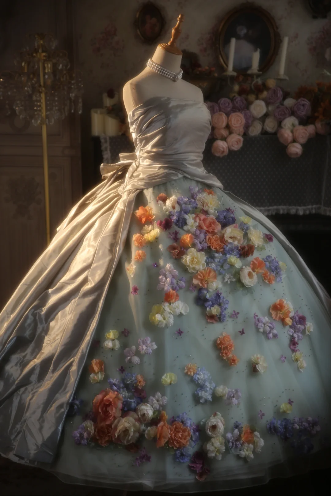 Vintage Ball Gown Strapless Satin Tulle Applique Long Prom Dress, Party Dress, Evening Dress GG2873